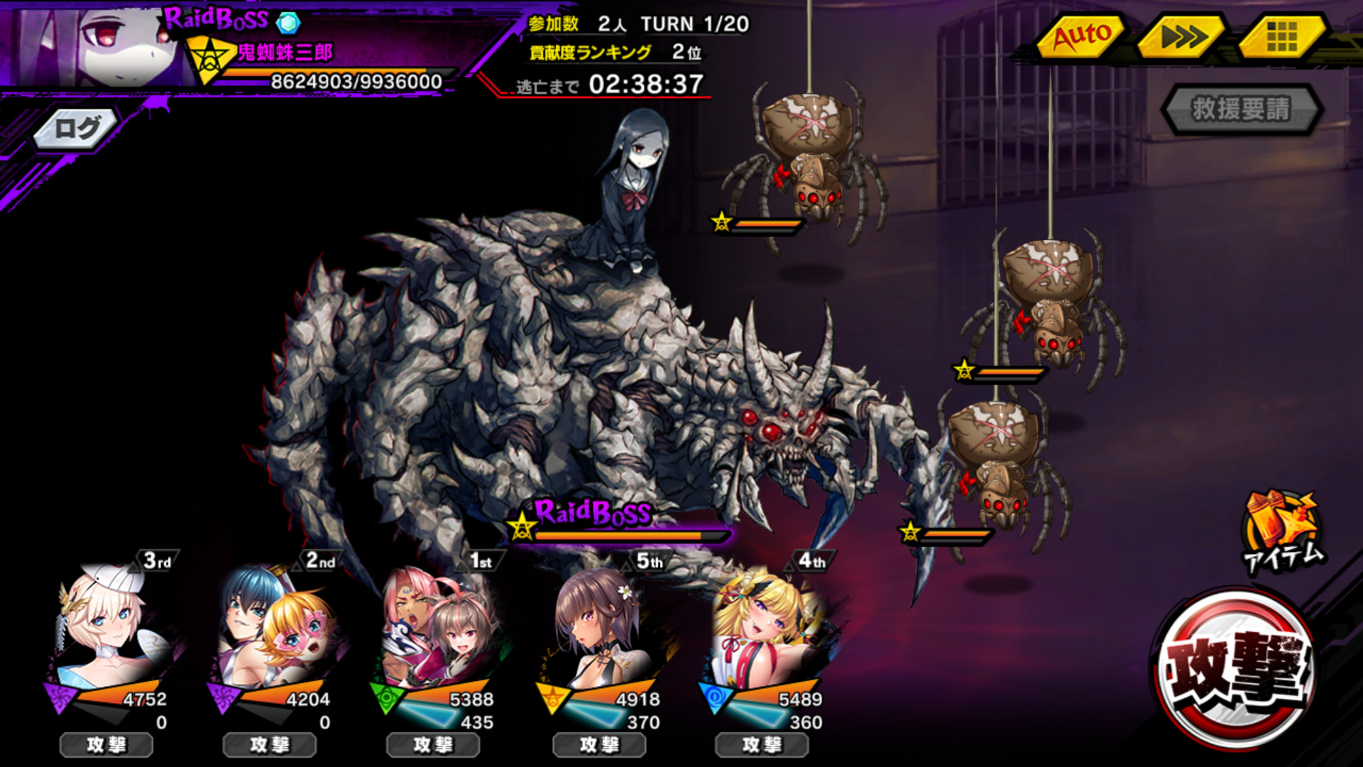 - オートで済ませたいなら1体ずつ忍蜘蛛をターゲッティングしていられないので、強力な全体攻撃を持つ化学属性のアタッカーを用意する。