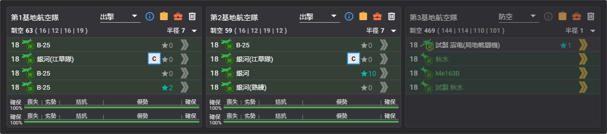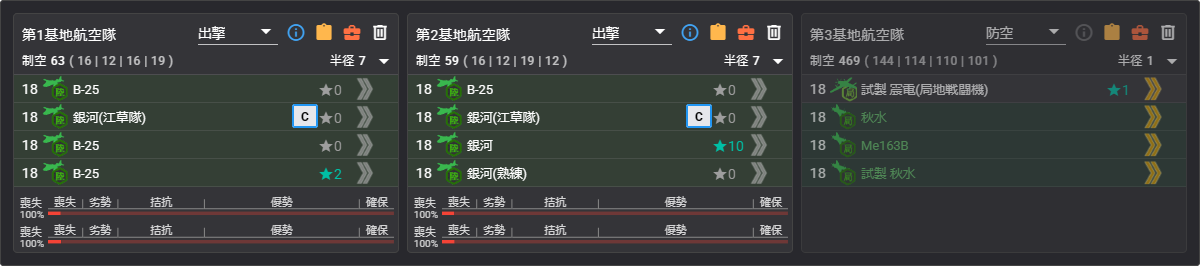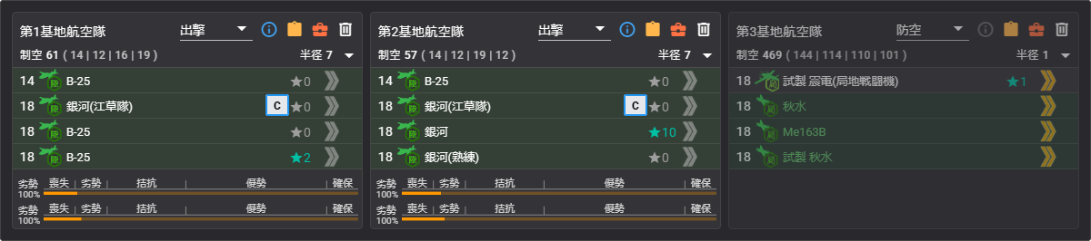 | 基地 | M 半径3 制空なし #1 – 陸攻4 N 半径2 制空なし #2 – 陸攻4 防空 優勢525 or 341 重爆 #3 – ロ戦3 陸戦1 |