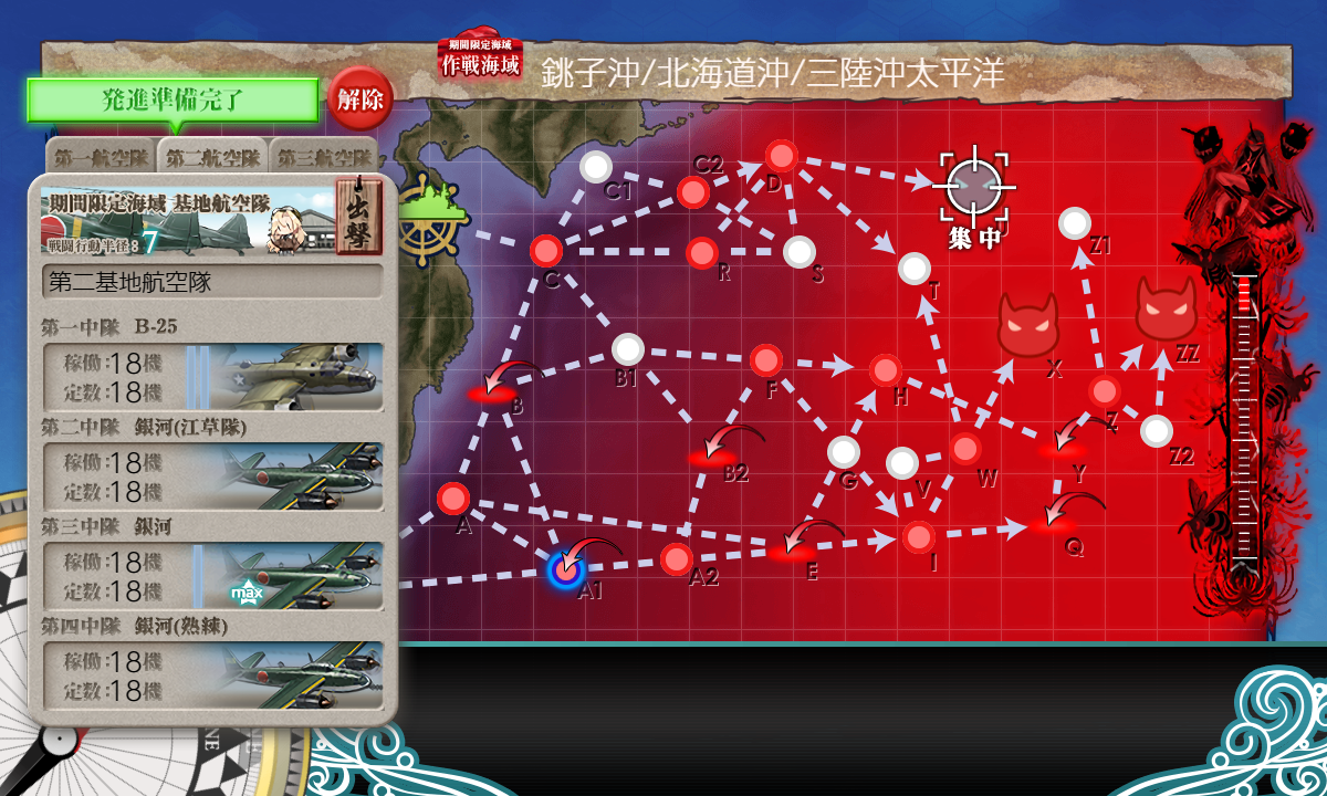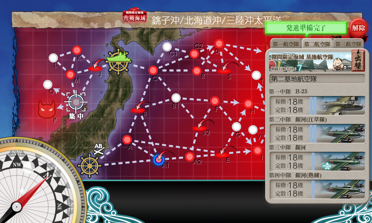 | 基地 | X 半径7 劣勢 前哨57? #1 – 陸攻4 #2 – 陸攻4 防空 優勢525 or 341 重爆 #3 – ロ戦3 陸戦1 |