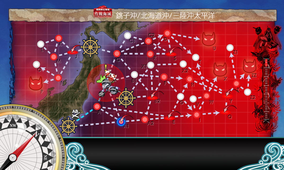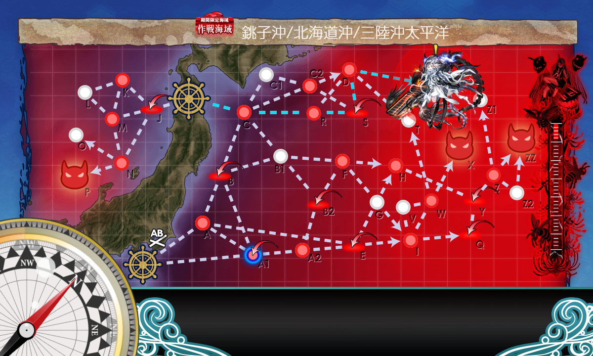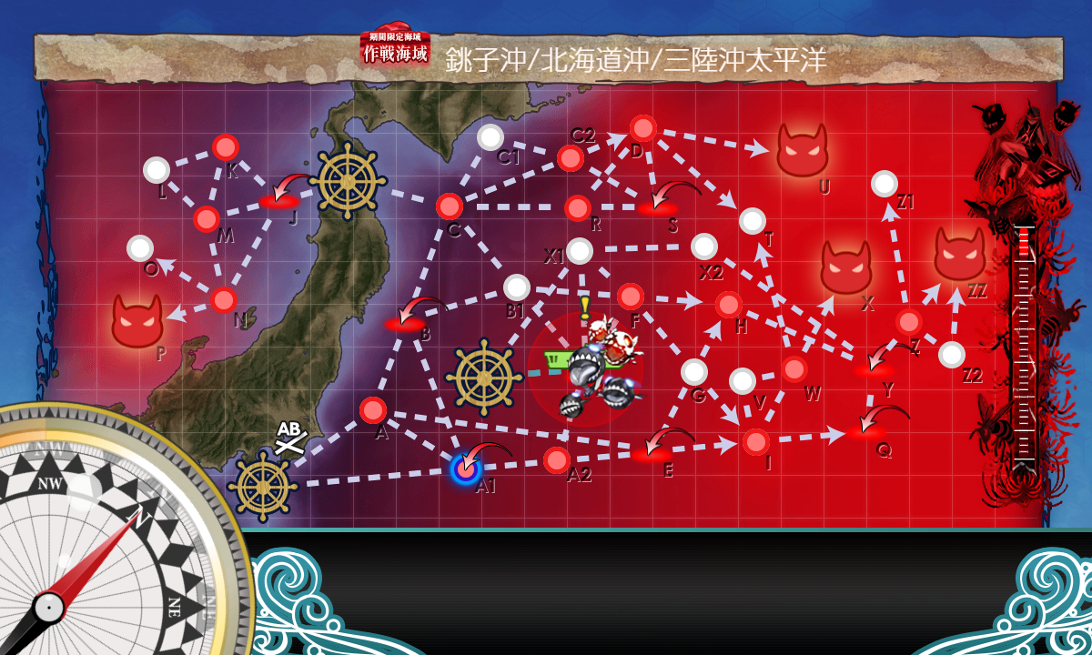 E5-4水上打撃部隊なら全部ZZまでの道中なので、次の最終形態用の編成と装備に切り替えて出撃。空襲マス優勢を1回ずつと、ZマスのS勝利1回が取れれば、それで装甲破砕ギミックは完了。そのままボスマスへ突っ込んでもOK。