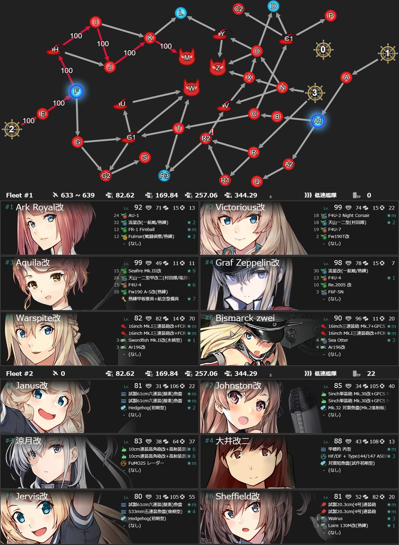 ・サブ欧州空母で空母機動部隊。後の装甲破砕ギミックでは水上打撃部隊を組まなければならないらしいが、破砕をするつもりがないので気にしない。もし破砕が必要なら、これは参考にせず、E3-1は水上で組んだ方がいいかも。