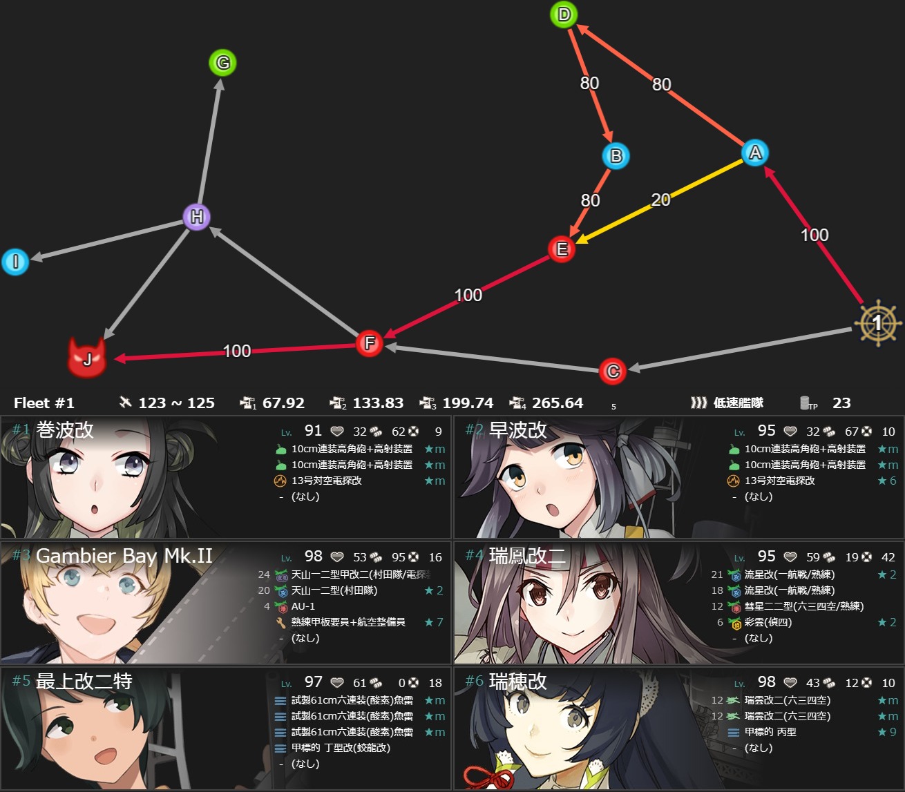 画像では軽巡と水母を使っているが、一番安全なのは潜水母艦を使うJマスを通る可能性が無いルート。※戦艦が出る
