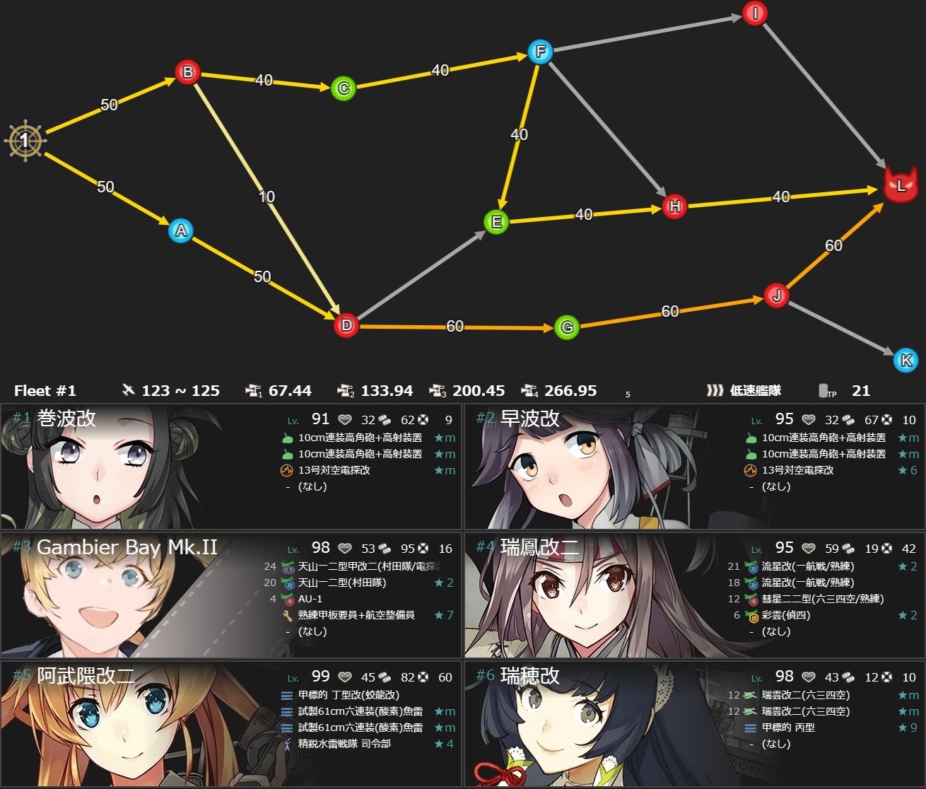 | 制空 | H・I・Jマス 優勢24 確保48 Lボス 優勢30 確保60 |