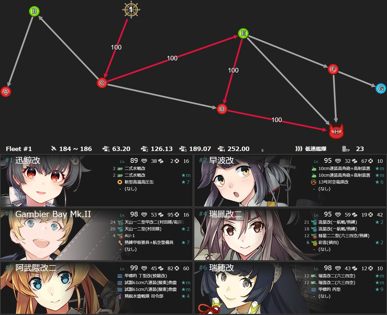 | 編成 | 指定駆逐艦2 [旗艦]、軽空母2、航巡1、水母1 指定駆逐艦2 [旗艦]、軽空母2、駆逐2 |