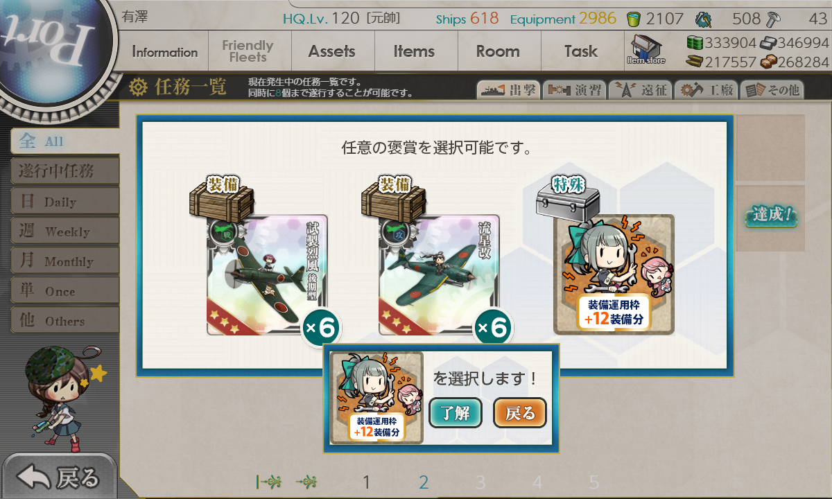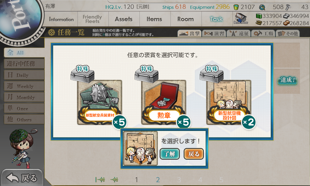 | 褒章 | 選択1:試製烈風後期型 x6 流星改 x6 装備運用枠 +12 選択2:新型航空兵装資材 x5 勲章 x5 新型航空機設計図 x2 |