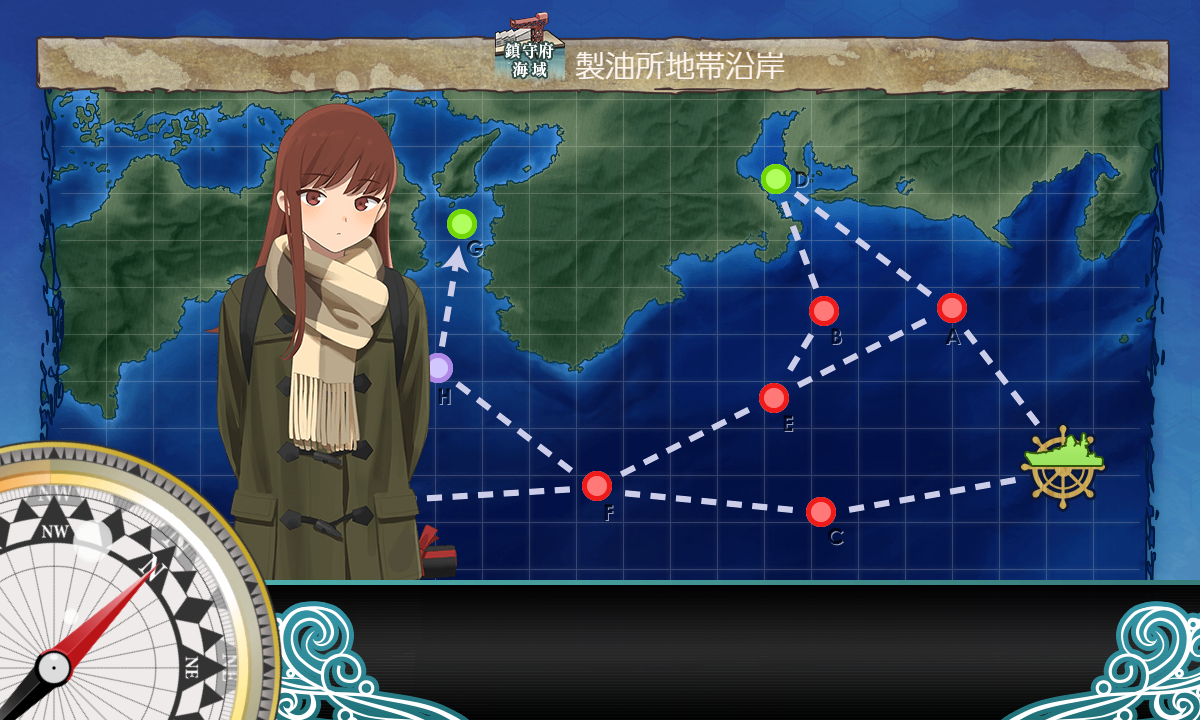 | 条件 | 「大井」「球磨」「鹿島」「神威」「大泊」「神風」「高波」「涼波」「藤波」「早波」「浜波」のうち、旗艦と他にもう2隻以上を含む第一艦隊で、製油所地帯沿岸、南西諸島防衛線、南西諸島近海を制圧せよ! ※「大井 球磨 鹿島 神威 大泊 神風 高波 涼波 藤波 早波 浜波」から旗艦を含む3隻以上を編成する。 |