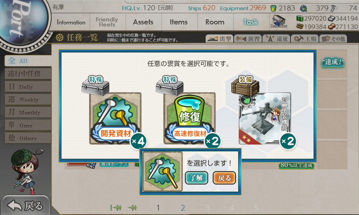 | 褒章 | 選択1:開発資材 x4 高速修復材 x2 25mm単装機銃 x2 選択2:給糧艦「伊良湖」x1 装備運用枠+2装備分 |