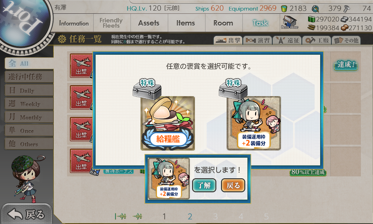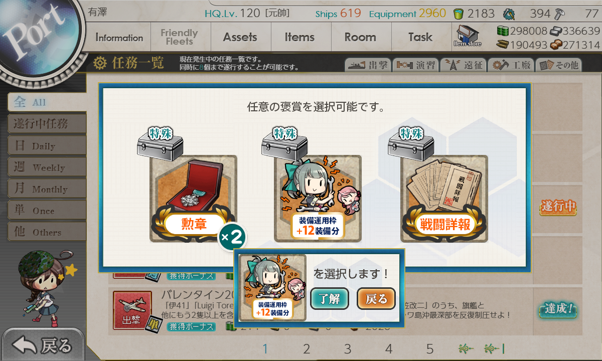 | 褒章 | 選択1:給糧艦「間宮」x2 補強増設 x2 選択2:勲章 x2 装備運用枠+12装備分 戦闘詳報 x1 |