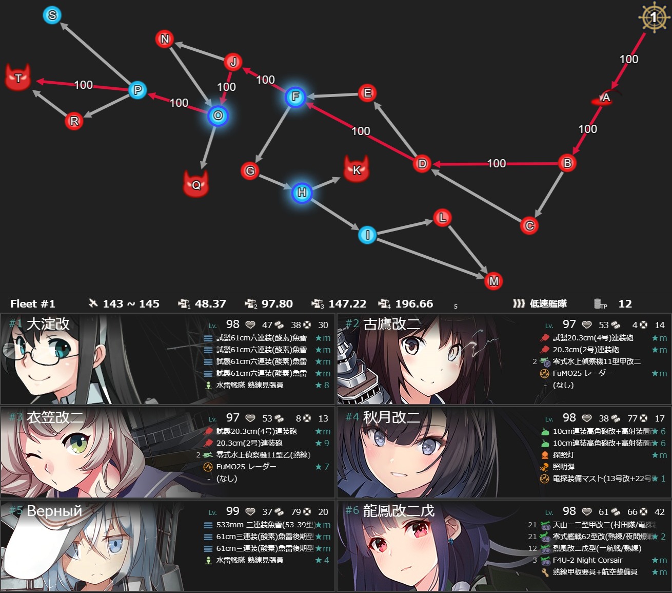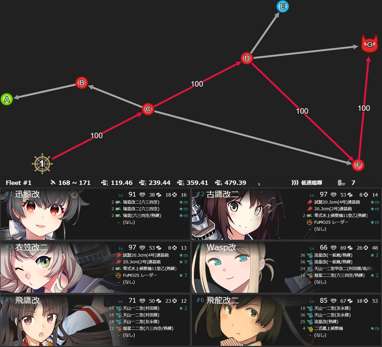 | 編成 | 大淀改 [旗艦]、古鷹改二、衣笠改二、軽空母1、駆逐2 |